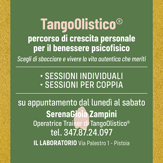 Sono SerenaGioia Zampini, connessa alla fonte: un Narvalo. Mi sento spesso una Volpe… o un Cavallo Nero che corre leggero sulla spiaggia. Selvaggia e istintiva come la natura e gli animali, vivo in autenticità e gioia di vivere nel presente, adesso. Mi rinnovo e rinasco ogni dì. Mi occupo di consapevolezza corporea, di percorsi dedicati all’espressione artistica e al movimento. Ti aiuto ad amare la tua essenza primordiale tramite la musica, la respirazione, la meditazione, la pittura per restare a contatto con te stessa/o e farti ri-trovare la tua capacità creativa e il tuo benessere psicofisico. Sono un’ Artista del Sentire a 360° e Performer indipendente, Creatrice di Podcast, Operatrice olistica, Operatrice Trainer di TangoOlistico® (tango terapia metodo Habib), Operatrice socio educativa per persone affette da patologie dello spettro autistico. Sono al servizio per sessioni individuali, per la coppia: on line o in presenza. E organizzo incontri e seminari per gruppi, ovunque : non solo a Pistoia.
