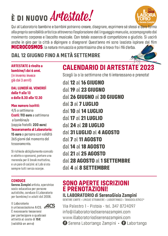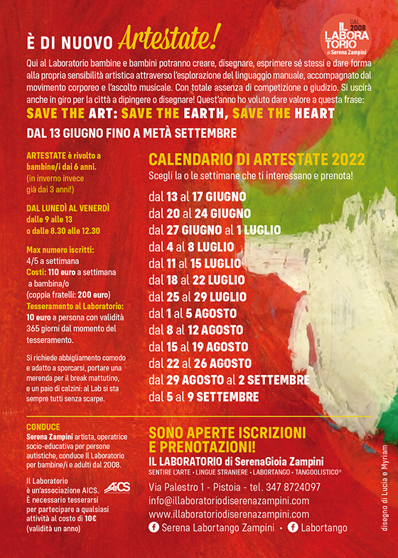 è il tema di ARTESTATE 2024: IL LABORATORIO di Via Palestro 1, a Pistoia, appena finisce la scuola, diventa il CENTRO ESTIVO per bambin* dai 6 anni compiuti in poi.