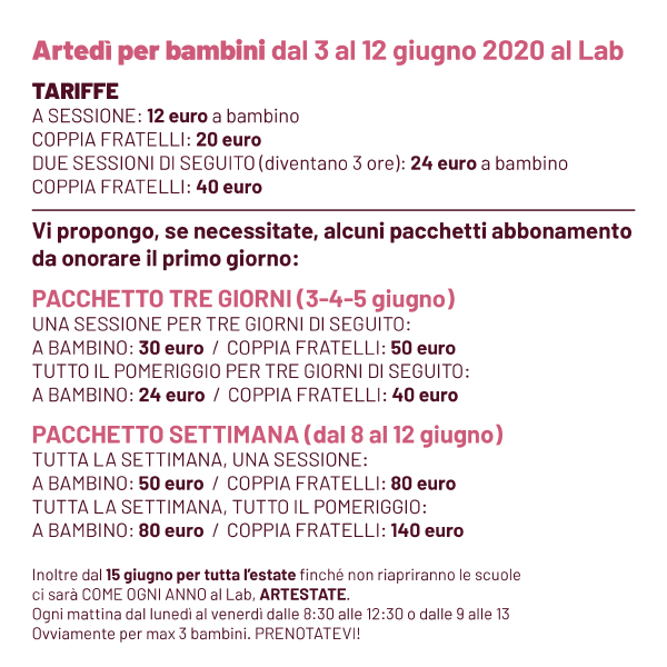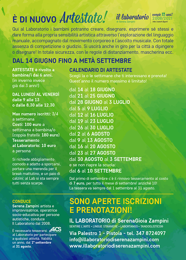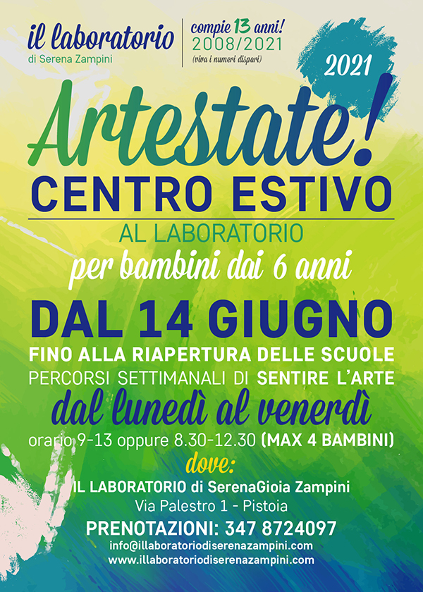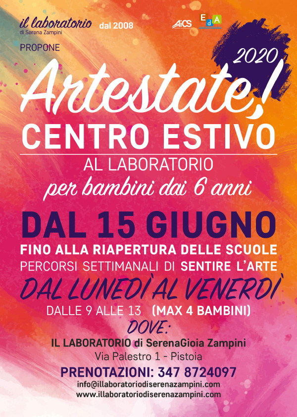 PS: Ricorda che …ARTESTATE vi aspetta, DA GIUNGO (appena chiudono le scuole) fino A META’ SETTEMBRE, con l’abituale ma “diverso” CENTRO ESTIVO che propongo da 14 anni. Ci sono anche per TUTTO AGOSTO. Sceglierai liberamente la o le settimane che ti interessano. A breve metto sul sito date e locandina!