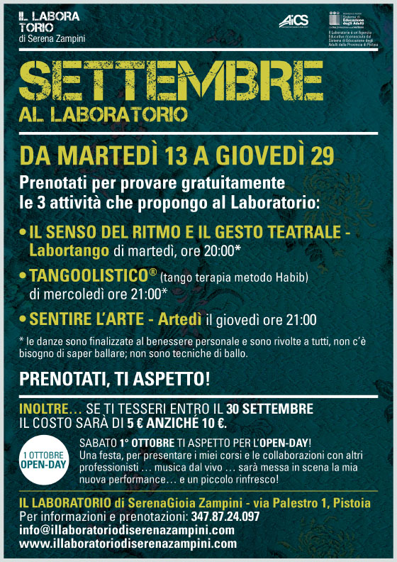 Dunque, vuoi metterti in gioco in gruppo, “recitare” solo con il corpo? Ogni mese hai la possibilità di farlo! IL SENSO DEL RITMO E IL GESTO TEATRALE-Labortango, è questo! Si lavora insieme, senza nessun pre requisito specifico se non quello di voler osare e provare a migliorare la consapevolezza fisica. Con gioia, ma profondamente, ogni martedì sera, dalle 20:00 alle 22:30 circa; se vuoi venire adesso, nel mese di ottobre, iniziamo martedì 4… fin al 25; si prepara insieme allenandosi, raccontandosi, conoscendosi, la nuova performance con un tema che vi proporrò il primo giorno. La metteremo poi in scena l’ultimo sabato del mese, il 29 ottobre, alle ore 19:00. Ci saranno gli spettatori, ci saremo noi, tu, gli altri partecipanti ed io, per 20 min. Il pubblico è con noi, noi interagiamo sempre con lui. Perché è relazione, è comunicare. E’ dialogo! E così è ogni mese.