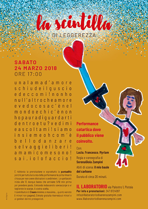 Con la SCINTILLA di leggerezza si lavora sull’effetto sorpresa e catartico che caratterizza da sempre i miei lavori con la danza, sul perdere anche per un po’ il controllo. Per essere nuovi e freschi, dopo.