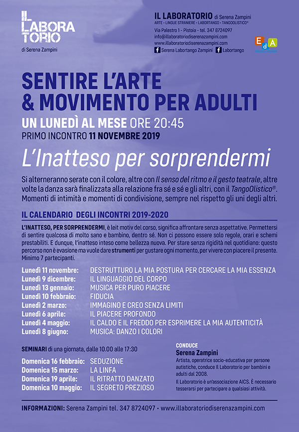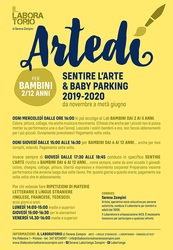 Colore, pittura, collage, ma anche musica e movimento. (Chissà che anche per i piccoli non si possa metter su performance una o due l’anno). Lasciate i vostri bambini a ora, non faccio abbonamenti per i più piccoli. Ovviamente prenotatevi!